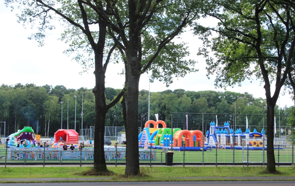 En dat wordt (weer) een vermoeiende dag, wel gaat de zon ons vrijwel ononderbroken begeleiden. Gelukkig! Deze keer neem ik mijn fotocamera mee. Jeugdcoördinator Ferdinand van der Veen heeft vanaf 10.00u een ochtendprogramma voor de jongste jeugd georganiseerd. De loodzware opblaasattributen arriveren. Die gaan energie vreten om op hun plek te krijgen, het is sjorren, trekken en duwen geblazen. Het zweet gutst van mijn hoofd. Ik neem mij voor om NOOIT meer zitting te nemen in een dergelijk comité. Tenzij het zo geregeld wordt dat anderen deze klus voor hun rekening nemen (in ruil voor een berg consumptiemunten bijvoorbeeld). Ik weet inmiddels dat die opblaaskussens vanmiddag ook weer opgeruimd moeten worden! Daar zie ik dus als een berg tegenop (ga ik mij “ziek” melden?). Zodra de springkussens staan wordt er door de jeugd volop van genoten. Vooral de waterglijbaan is in trek. Op de gymnastiekmat worden spectaculaire salto’s gemaakt. De indrukwekkende generator van Haarhuis blijkt defect en wordt netjes vervangen. Ook een probleem met de twee beeldschermen wordt verholpen.